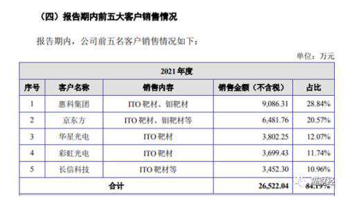 报告期内,映日科技前五大客户包括惠科集团、京东方、华星光电、彩虹光电、长信科技,销售金额分别为7601.00万元、10692.54万元和26522.04万元,占公司营业收入的比例分别为67.48%、72.43%和84.19%,客户集中度逐年上升。