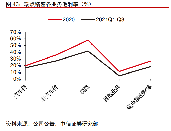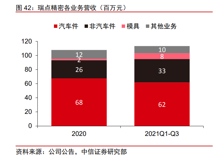 目前公司精密塑胶业务主要形成汽车、生物实验室、消费电子三大板块,短期看我们认为消费电子有望贡献主要增量,长期看公司有望在汽车、生物实验室等领域获得突破,且多业务协同下有望打开更大市场。公司精密塑胶件业务以原有车载端和生物实验室产品为主,2021Q1-Q3,瑞点精密实现营业收入1.13亿元,其中车载业务实现营收6200万元,占比54.9%。收购瑞点精密后,公司积极切入消费电子塑胶件业务,目前产品已应用于国内头部消费电子终端品牌H客户的可穿戴产品。