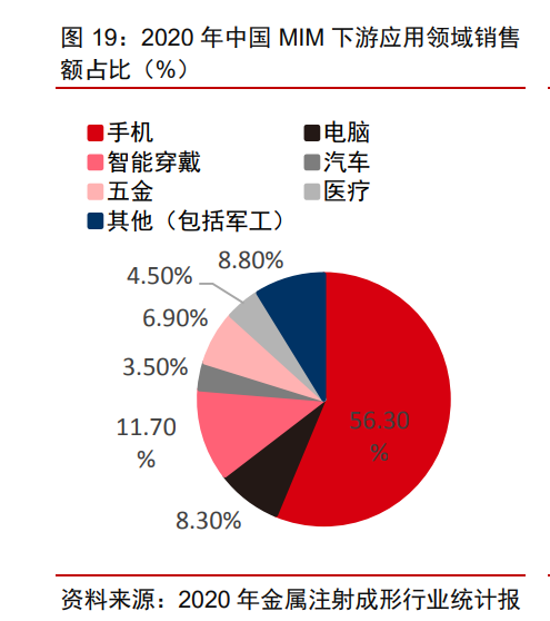 —聚焦国内市场,以手机为代表的消费电子占据最大份额。根据《2020年金属注射成形行业统计报告》,目前国内MIM技术的应用主要集中在电子产品领域,其他领域的应用占比相对较少。从销售额角度看,2020年我国MIM产品的应用分布中,手机/智能穿戴/电脑三大应用场景分别占56.3%/11.7%/8.3%。其中手机继续保持最大份额,但同比略下降2.8pcts,电脑、智能穿戴领域产品占比则有增加,分别同比+3.5/+3.6pcts。其他应用领域方面,汽车、五金、医疗分别占比3.5%/6.9%/4.5%,分别同比-6.8/-5.1/+1.0pct。