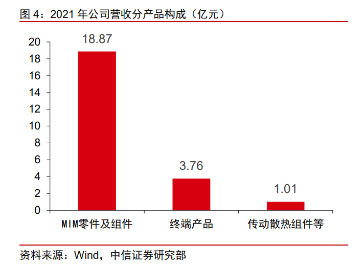 分产品来看,2021年度公司主营业务中MIM零部件及组件收入18.87亿元(同比+29.18%),占营业收入的78.48%;终端产品(主要系安特信的TWS耳机业务)收入3.76亿元,占营业收入的15.65%;传动、散热类组件及其他收入1.01亿元(同比+19.79%),占营业收入的4.18%。近年来公司在深度挖掘消费电子领域MIM产品应用的基础上,通过技术积累及兼并收购等方式拓展在汽车制造、生物实验室、智能家电等领域的规模化应用,我们看好公司未来业务及产品结构的不断拓展。