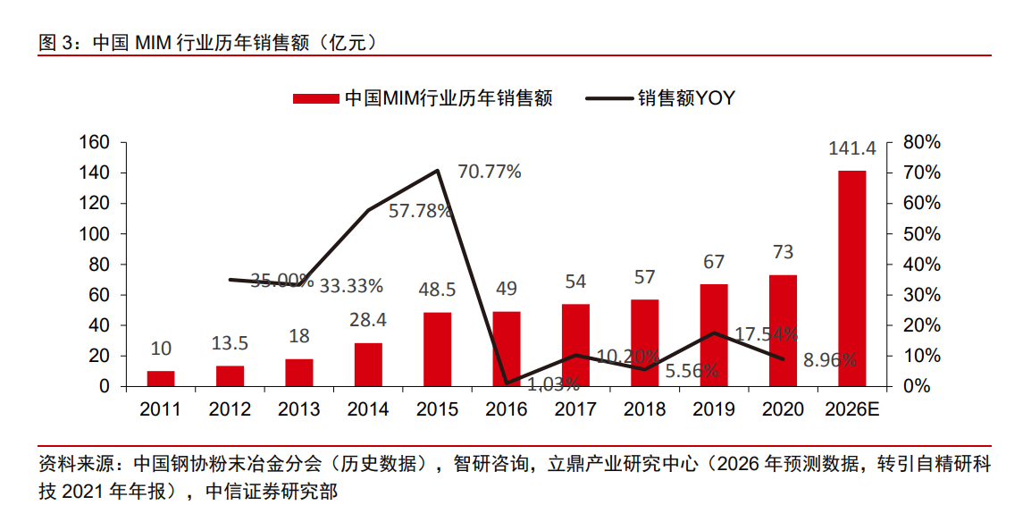 聚焦国内市场,预计2026年市场空间达141.4亿元,2020-2026年CAGR达11.6%。据智研咨询援引的中国钢协粉末冶金分会数据,2020年国内MIM行业销售额约73亿元,2011-2020年CAGR达24.72%,其中贡献最大增量的主要是消费电子类应用,如智能手机摄像头支架、折叠屏铰链、TWS耳机、智能手表等,5G配套器件与医疗器械也有所增长。展望未来,MIM料将持续受益下游应用领域多点开花局面,消费电子、汽车、机械、医疗等多个领域的蓬勃兴起将拉高MIM行业规模天花板,据精研科技2021年年报援引立鼎产业研究中心数据,预计至2026年我国MIM市场规模将达到141.4亿元,2020-2026年CAGR达11.6%。