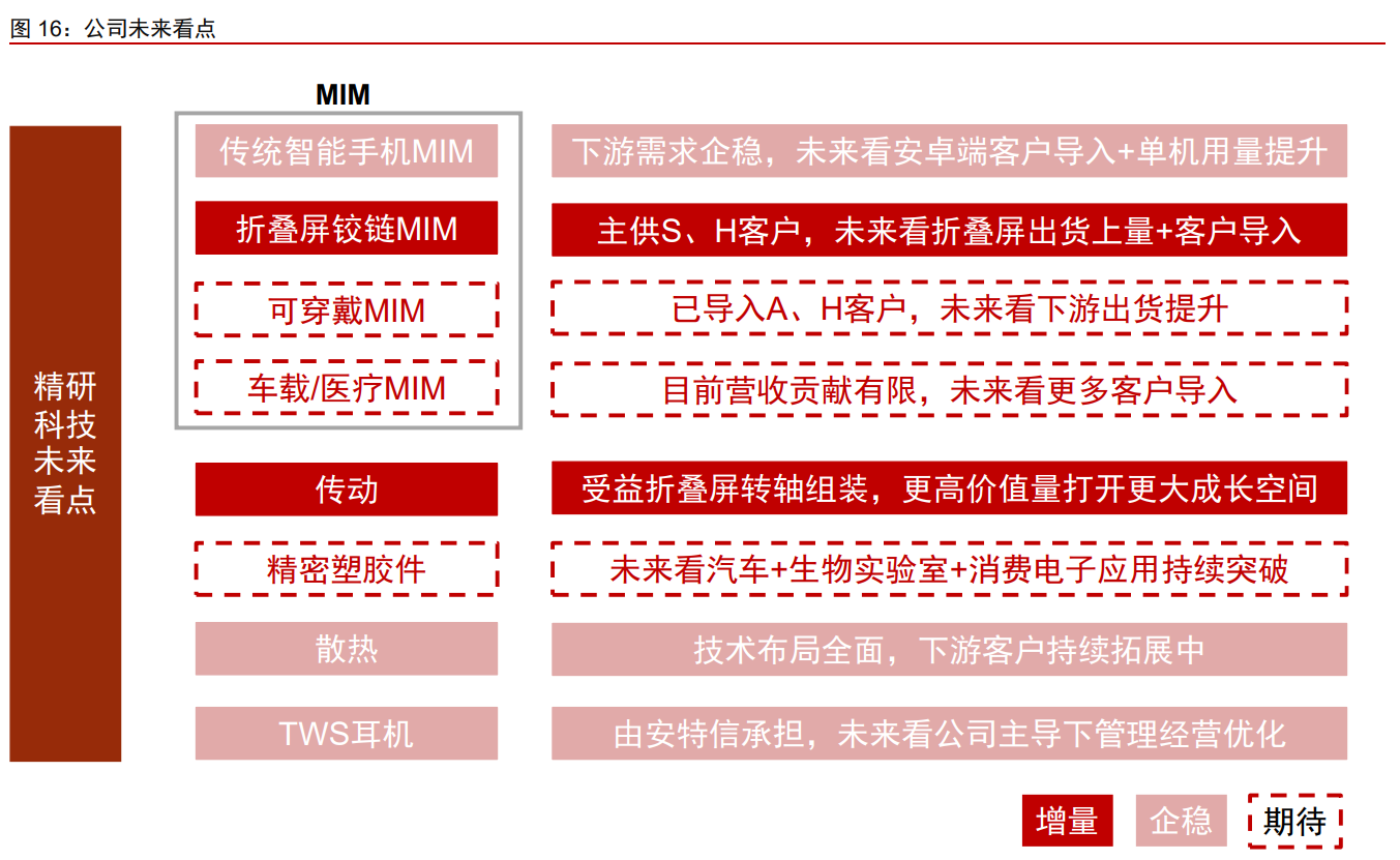 展望未来,手机方面,随全球手机出货动力趋弱及多摄趋势放缓,预计后续传统手机MIM产品将平稳发展,折叠屏市场加速放量预计将带动铰链业务高速成长,为公司MIM业务贡献最大业绩增量;可穿戴方面,我们看好智能手表、TWS等下游终端产品的高成长性,公司客户结构优质,有望持续受益;车载及医疗方面目前MIM零件营收贡献较少,未来看客户进一步导入。