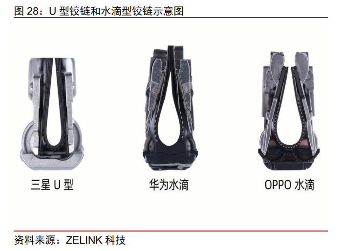 更大的弯折半径让屏幕弯折和蠕变分散在较大范围,塑性变形更小,从而缓解物理折痕。铰链复杂程度提升将带来MIM用量增长,普通的U型铰链零部件数量60+个,成本约150-200元;而水滴铰链零部件数量普遍达130+个,成本为U型铰链的3-4倍。尽管价格更高,考虑到水滴型铰链在降低折痕方面效果更优,我们预计未来会成为主流。据赛诺市场研究公众号,2020年折叠屏铰链中U型铰链占比60%,2021年水滴型铰链加速渗透,份额达65%。截至2022年4月,H客户MateX2及P50Pocket、R客户MagicV、O客户FindN、V客户XFold均采用水滴型铰链方案。