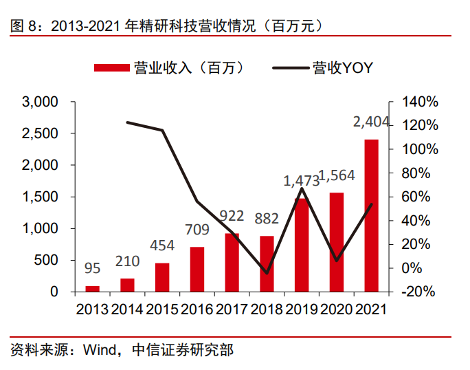 2016年,公司A园区正式投入生产,并成立子公司精研(东莞)科技发展有限公司,为客户提供PVD真空镀膜加工,同年成立CNC部门和自动化部门,可对外承接部分业务;2017年,公司成功上市深交所创业板,成为全球首家上市的MIM行业上市公司,同年精研B园区开工(以MIM业务为主),并成立香港、美国子公司;2018年,精研B园厂区竣工;2019年,公司成立传动散热事业部,推进业务由零件制造往组件制造业务发展,助力客户结构的不断优化;2020年,精研C园厂区开工;2021年,精研D园区开工,同年收购安特信60%股权,业务拓展至终端产品。