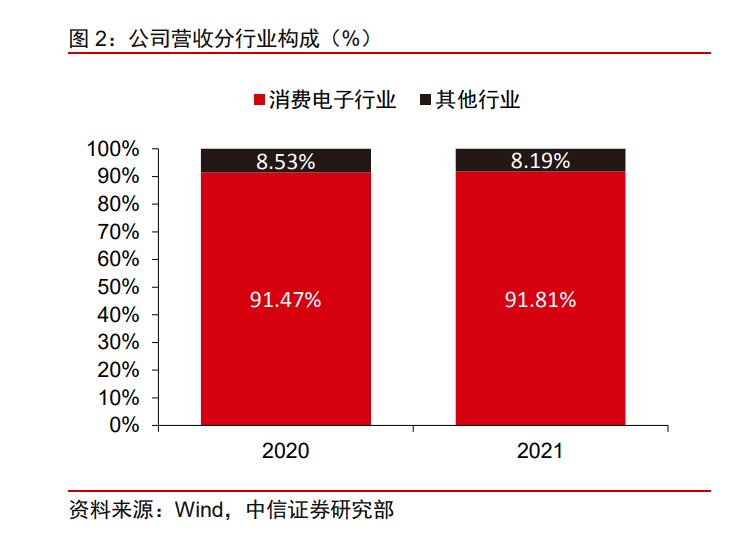 业务构成:2021年,消费电子业务营收占比达92%;MIM零部件及组件贡献近8成营收。公司目前主要提供智能手机、可穿戴设备等消费电子领域的定制化MIM核心零部件产品,2021年实现营业收入24.04亿,同比+53.70%;实现归属于上市公司股东的净利润1.84亿元,同比+29.64%。分业务看,2021年公司消费电子行业/其他(行业)的营收占比约92%/8%,毛利占比约93%/7%。
