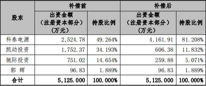 股权补偿之前,科泰电源持有精虹科技的股权比例为49.264%。凯动投资以无偿转让注册资本1145.99万元,转让的股权比例占持股比例的22.361、驰际投资转让注册资本491.14万元,转让的股权比例占持股比例的9.583%,作为2018年业绩补偿,使公司的投资额达到公司对精虹科技实际投资总额1.51亿元,持股比例为81.208%。