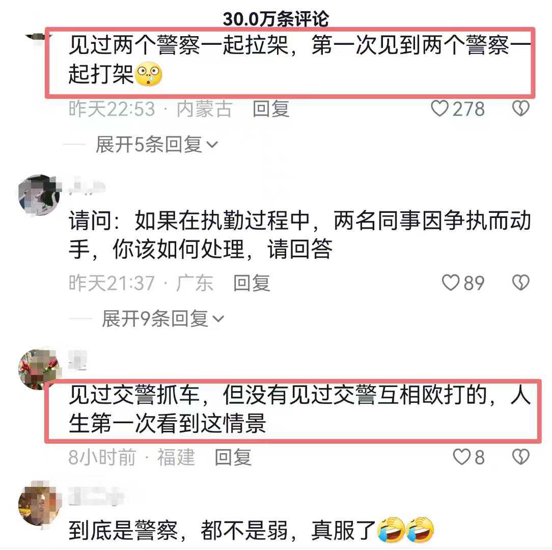 警察和警察打架,这样的阵仗还是第一次见,很多人都觉得这件事情很离谱,旁边的外卖小哥都不忙着送单了,把车停下来看得入迷。