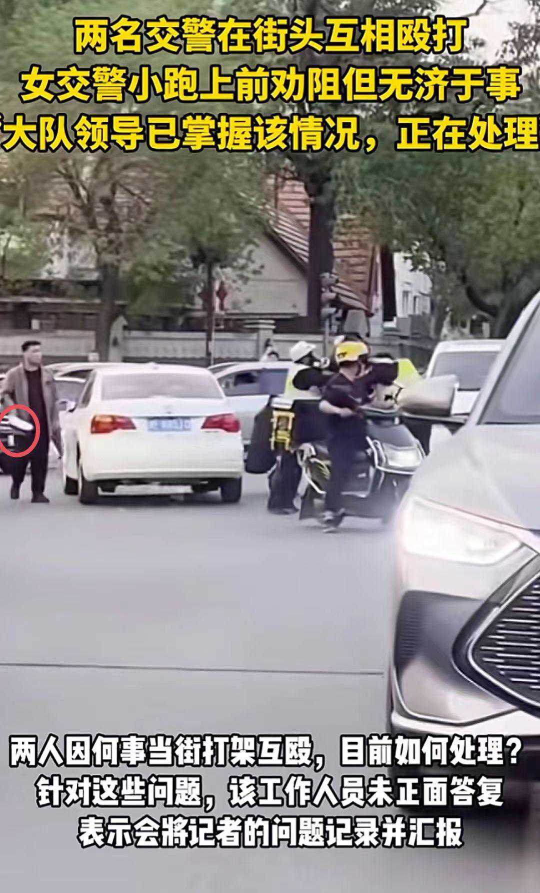 一名女交警见状飞奔过来拉架,可是她根本拉不开两个男交警,两名交警从一辆白车面前,打到一辆电瓶车面前,骑车的女士走也不是,留在那里又怕误伤自己,看起来手足无措。