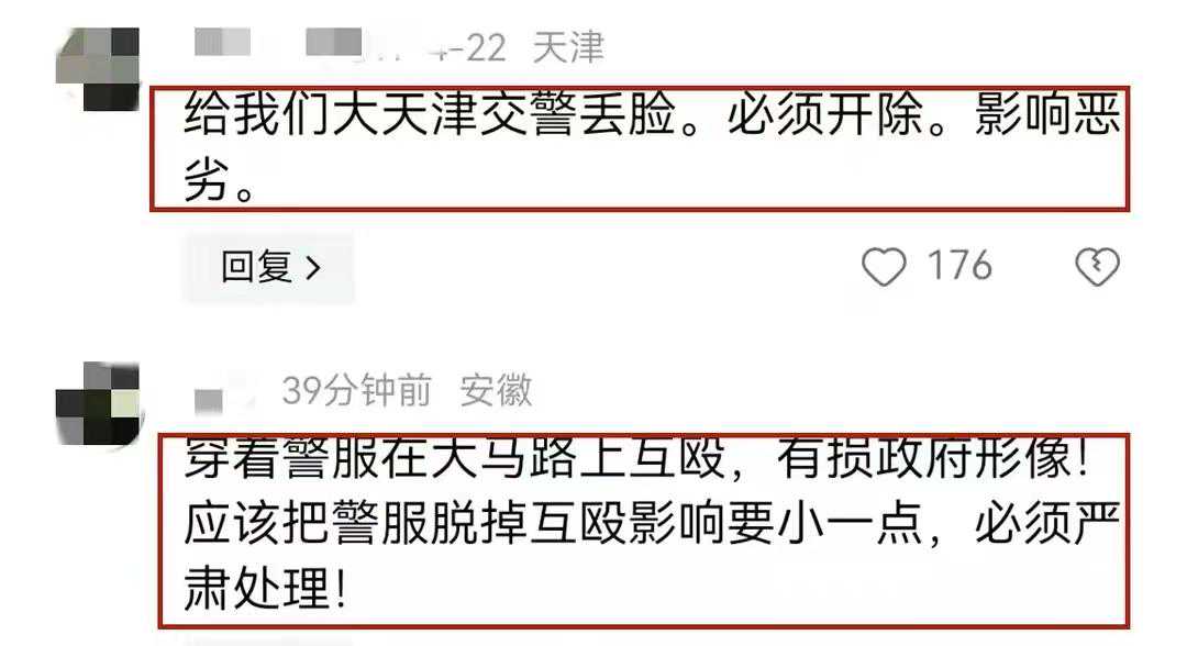 也有网友指出,这件事情性质非常恶劣,严重影响警察形象,就算要打架,好歹把警服脱了再打,这下把天津交警脸都丢光了,必须严肃处理。