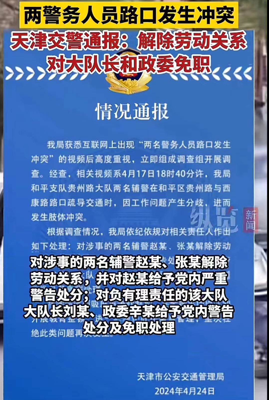 4月24日,天津交警部门就“天津2名交警街头互殴”事件做出了最新通报:打架的两名辅警被解除劳动关系,交警所属大队的大队长和政委做出免职处理。