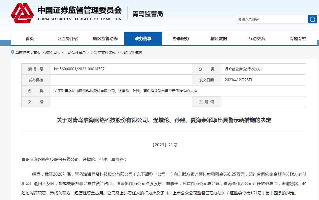青岛证监局查明,截至2020年底,青岛浩海网络科技股份有限公司(下称浩海科技)向关联方累计预付房租租金668.25万元,超过合同约定金额向关联方支付租金且退回不及时,构成关联方非经营性资金占用。