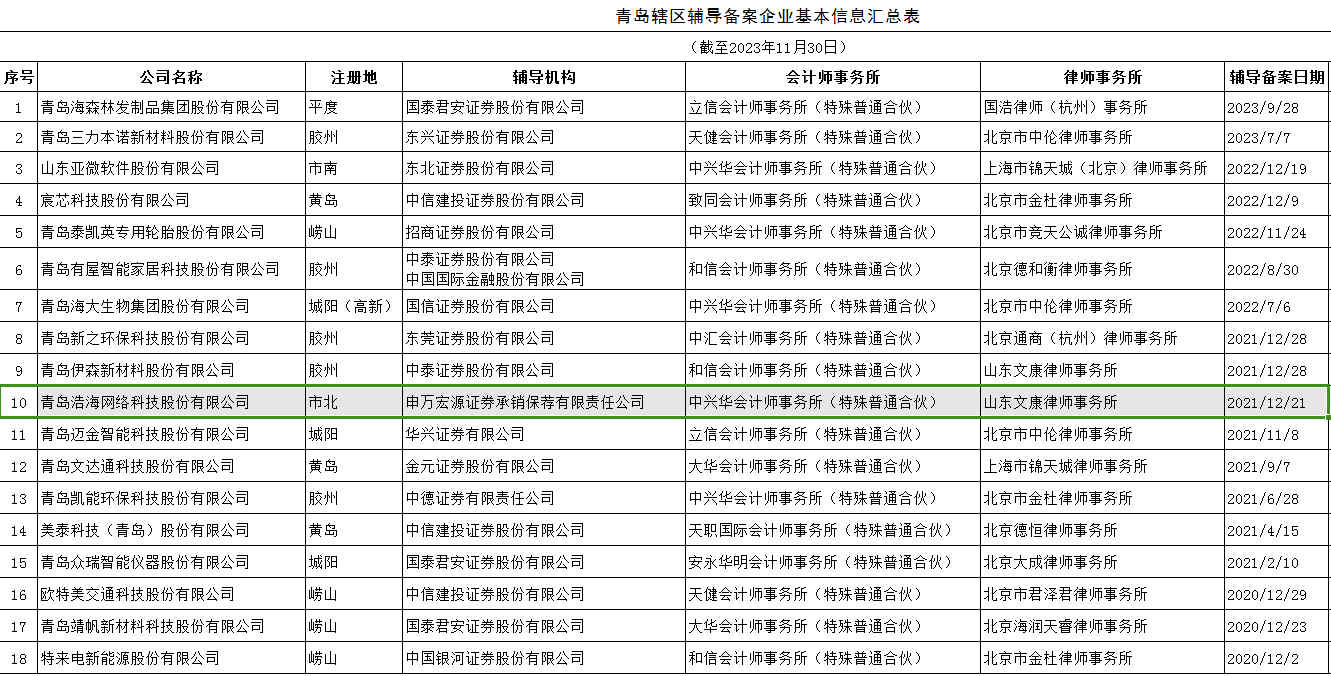 青岛证监局网站《青岛辖区辅导备案企业基本信息汇总表(截至2023年11月30日)》