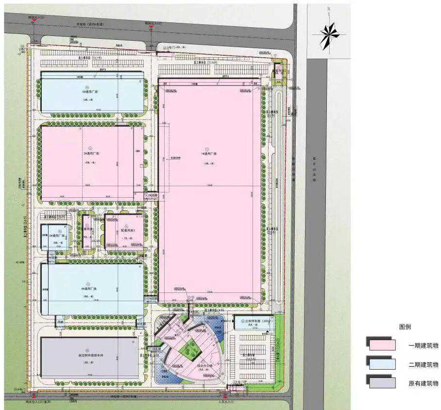 项目用地面积12.16903公顷(折合182.54亩),分两期实施,一期建设内容为1通用厂房(含高度不超过35M的通风井),综合楼、配套用房1,2,3、门卫等,二期建设内容有3-6#通用厂房,停车楼等。